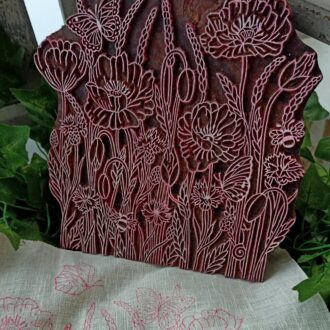 Stoffdruckstempel „Mohnwiese mit Getreide & Schmetterlingen“ – handgeschnitzter Holzstempel für florale Naturmotive & kreative DIY-Projekte